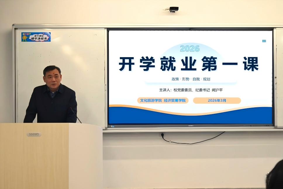 为帮助2026届毕业生认清就业形势、明晰职业方向,切实提升就业竞争力,近日,校党委委员、纪委书记阙沪平走进经济贸易学院、文化旅游学院,为两学院毕业生讲授“开学就业第一课”,相关部门负责人到场聆听。