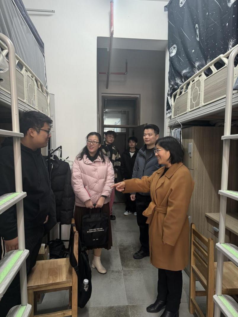 午餐结束后,贺美兰副校长一行前往学生宿舍,深入了解学生起居情况。她走进多间宿舍,仔细查看环境卫生、设施设备运行及安全保障状况,与同学们亲切交谈,关切询问住宿体验、冬季生活便利等实际需求。针对同学们提出的宿舍相关建议,她认真倾听并记录,叮嘱大家增强安全防范意识,尤其注意用电安全,养成良好卫生习惯,共同营造整洁和谐的宿舍氛围。